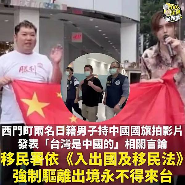 社群平台流傳一段影片,2名日本籍男子在西門町宣講,手中拿著中國國旗,並發表「台灣是中國的」等不當言論,移民署在第一時間掌握相關情資並展開調查,進而確認2人是免簽證入境的日本籍旅客,2人行為已涉犯《入出國及移民法》第18條第1項第13款,有危害我國利益、公共安全或公共秩序之虞規定,而且違法事實明確,本署依法開立強制驅逐出國及管制入境處分。移民署說明,其中1名日籍人士隼人,當天入境拍完片後隨即離境,目前已列管禁止他再入境;另名日籍人士弘幸,經調查後坦承參與拍攝影片,移民署已於今天上午將他強制驅逐出國,同樣列管禁止再入境,藉以展現執法決心,絕不容許外籍人士在台從事危害國家利益或公共秩序之行為。移民署重申,針對任何外籍人士在台從事危害我國利益、公共安全或公共秩序之行為,本署均將依法嚴正處理,並與相關機關密切合作,藉以維護國家安全與社會秩序。日男來台舉五星旗拍矮化片!日本人全怒了 身分起底「有前科親中網紅」 | 政治 | 三立新聞網 SETN.COM https://bit.ly/4fTmH4x