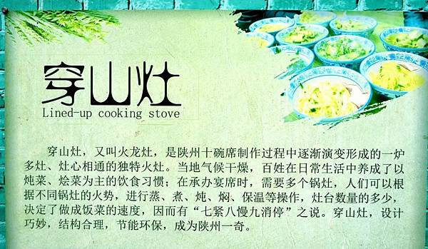 河南三門峽陝州地坑院的穿山灶也叫七星灶,神秘、環保、很實用。地坑院的特有爐灶穿山灶呈斜坡狀,依序向上,爐心相通,依熱氣往上走的原理設計而成。依序開九個灶孔,可以同時放置九個鍋,每個鍋子的功能和大小各不同。穿山灶的第一個灶火最旺,適合蒸煮,隨火力依序減弱。一個穿山灶,兩個師傅,可以做出三百人的飯菜來。當地有七緊、八慢、九消停之說,意思是宴請賓客做流水席的時候,七個鍋子有些緊張,八個鍋子有些慢,九個鍋剛好。地坑院十碗席有扣碗肉、小酥肉、辣豆腐、燉土雞、雜燴菜、黃花菜、海帶絲、小豆芽、拌芹菜、拌粉條。