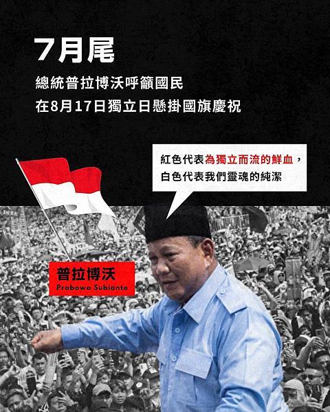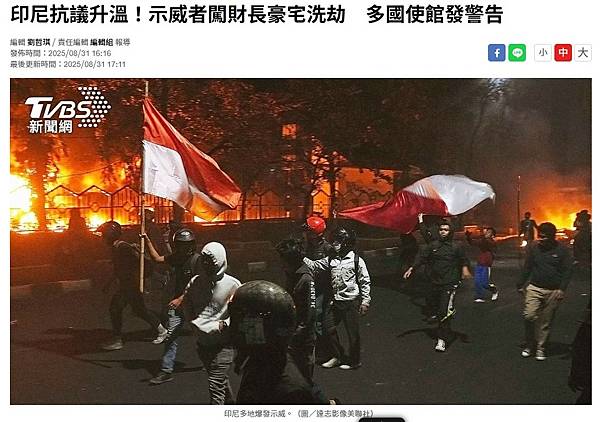 印尼因生活成本上升與貧富差距擴大而引發的抗議活動,因一名騎士在示威中遭裝甲警車輾斃,更加激化民眾怒火。總統普拉伯沃(Prabowo Subianto)緊急取消原訂訪中行程。據報導,示威者更將矛頭指向財政部長及多名國會議員住所,局勢持續緊張。