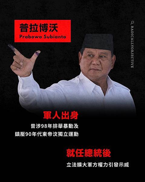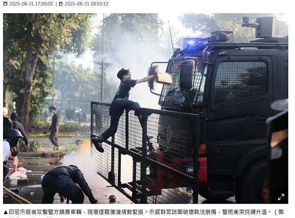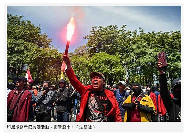其中,印尼爆發全國性的示威與暴動,導火線是民眾對於國會議員被認為享有過多額外薪資等自肥福利的長期不滿,以及一名摩托計程車司機遭警用裝甲車輾斃事件。目前局勢惡化,抗爭怒火攻陷財長豪宅,裝甲車進駐首都雅加達,印尼總統普拉伯沃(Prabowo Subianto)也取消北京之行。