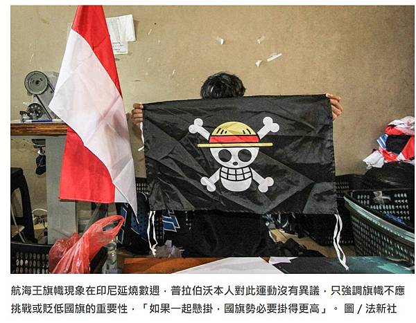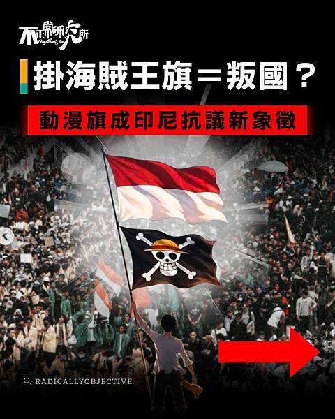 但在最近,《航海王》可不只是種文化消費現象,靠著年輕人都知道它,它還出現了政治象徵意義。8月的印尼雅加達街頭,9月初的尼泊爾加德滿都,21日的菲律賓馬尼拉,這些地方的大規模反貪腐抗爭現場,都能見到代表主角魯夫一行人的海盜旗。