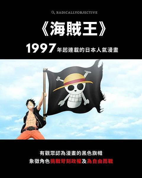而除了《航海王》是全球年輕人的共同回憶,以及主角的英雄氣質,網路和社群媒體的推波助瀾,和海盜旗一目了然的圖樣,同樣促使年輕人的採用。