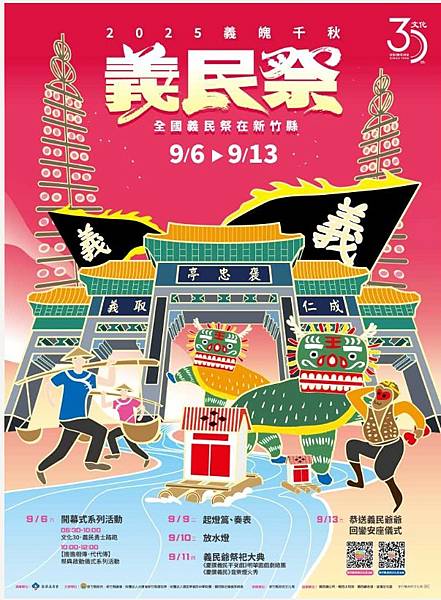 今年也適逢地方文化單位設立30週年,特別規劃「文化30.義民勇士路跑」嘉年華活動,結合運動、潮流與文化,作為系列慶典開跑儀式。同時設計「挑擔儀式」、「跨界藝陣舞劇」、「祈福祭典」等精采活動,展現傳統與創新交融的客家文化面貌,邀請全國民眾共襄盛舉,體驗全台規模最大的義民祭慶。