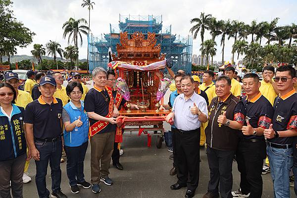 新竹縣副縣長陳見賢(中左)、關西聯庄祭典區副主委吳祥光(中右)等和信眾一起把義民爺的牌位傳出出義民廟,交給輪值祭典區迎回關西奉飯。(記者黃美珠攝)2025義民祭起跑 義民爺今起1個月駐駕輪值祭典區接受奉飯 https://bit.ly/3UX9uhB