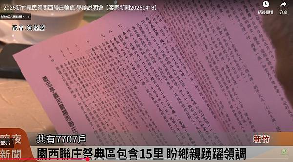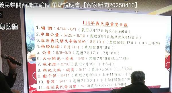 新竹縣文化局朱淑敏局長:我們傳統祭典這個儀式是在農曆七月十八到七月二十,那在今年就是9月9號到9月11號會在我們義民廟還有我們的祭典區,來舉行那這個非常重要的祭典儀式,裡面有包括我們的起燈篙、放水燈還有我們的祭祀大典,都非常具有意義,那在這次我們一樣都是會有豬羊大賽,那因為整個傳統來講的話事實上也已經慢慢地做一個轉型了,就是我們希望可以做一個教育扎根,讓孩子們來了解我們義民爺的一個精神,這2025義民祭起跑個小朋友一起來進行客語的禮生的一個訓練,9月6號的時候來做一個呈現,那9月6號是我們包括我們的義民勇士路跑也是我們文化30的一個起跑的一個儀式,在9月11號的晚上牛欄河邊的這個廣場,我們會由明華園戲劇總團俠猫的一個忠義精神,這樣子的一個戲劇在我們祭典區來舉行。