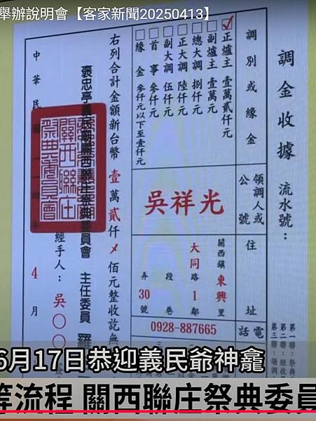 他也說,關西聯庄15年前輪值,共有1500多名信眾「領調」,這次約有1300多人,但實收「調金」跟15年前不相上下,可見鄉親參與的踴躍度一如過去。