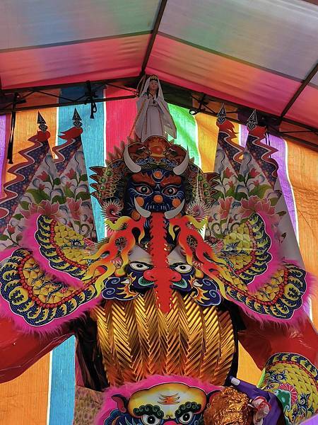 竹架紙糊製作的大士爺,俗稱鬼王,負責的工作是 #掌管眾鬼,晚上也來到慈天宮的攝影家葉裁老師說,大士爺會走在北埔街上巡視,看看有沒有搗蛋「鬼」,最特別的是,兇猛的大士爺頭上有一尊觀音,可想見觀音的地位,有象徵慈悲以及督導大士爺之意。