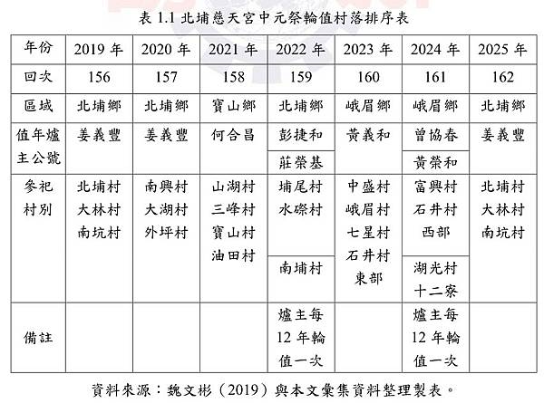 今年(114)值年輪值區為北埔鄉北埔、大林、南坑等三村,值年爐主為北埔姜家的姜義豐公號,農曆七月十三、十四連兩天於北埔慈天宮舉行中元祭典普渡法會,依循傳統儀式 — 起鼓、奏表、起燈篙、獻午眾、放水燈、大士爺移駕、獻神豬、普渡、下燈篙、火化大士爺,按古禮而行。