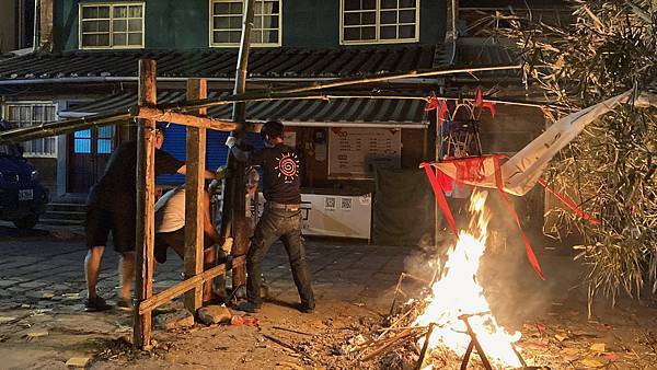 除了明顯是豎燈篙「教練」的阿伯較少言,其他叔叔都是這三到五年內來幫忙,也有第一年來幫忙的叔叔。這場盛大的祭典器材都比一般規模還要大且重,像是木板、神桌、柱子等等,叔叔們得用上十足力氣搬運,更不用說豎燈篙與下燈篙這個動作。