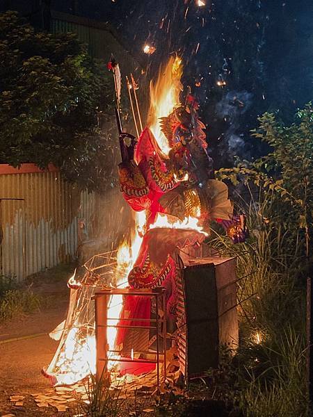 祭典的重頭戲之一,莫過於第二天晚上 #火化大士爺。晚上十點長達四小時的法會誦經結束後,可以看見一旁等候已久的黃家阿公阿婆開始燒金收供品,如我一般的紀錄者則紛紛追上大士爺,由工作人員抬著大士爺一路去到北埔市場旁的「 #邦正園」焚燒(大隘開墾時期的無主孤魂,據說北埔人稱此為大地),象徵回歸陰間,儀式結束。