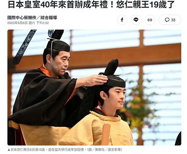 2025年9月6月是日本皇室秋篠宮文仁親王與紀子妃之子悠仁親王的19歲生日,這是自1985年以來,日本皇室首次有男性成員接受「元服、加冠」,如此隆重的儀式。不只伯父德仁天皇與雅子皇后,連上皇爺爺與奶奶美智子也都來了!此前天皇獨生女愛子與悠仁姊姊佳子在20歲時也舉行了盛大的成年祝賀之儀。