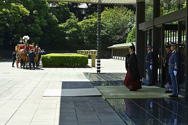 完成加冠之儀後,悠仁換上成年皇族穿著的黑色袍子,乘坐馬車前往皇居宮中三殿,舉行「謁於賢所皇靈殿神殿之儀」,向祭祀天照大神的賢所等殿宇行拜禮。