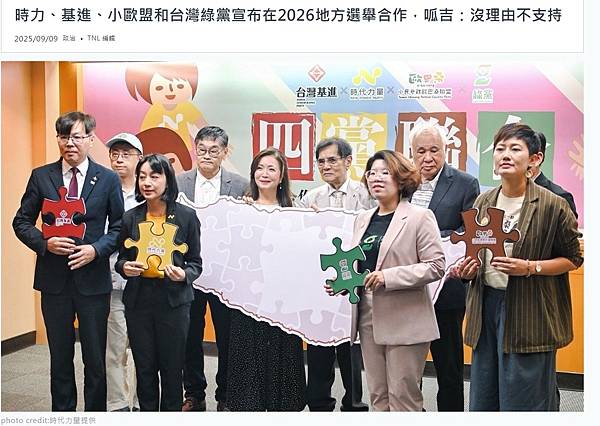 時力、基進、小歐盟和台灣綠黨宣布在2026地方選舉合作,呱吉:沒理由不支持 - TNL The News Lens 關鍵評論網 https://bit.ly/3VHe9nY