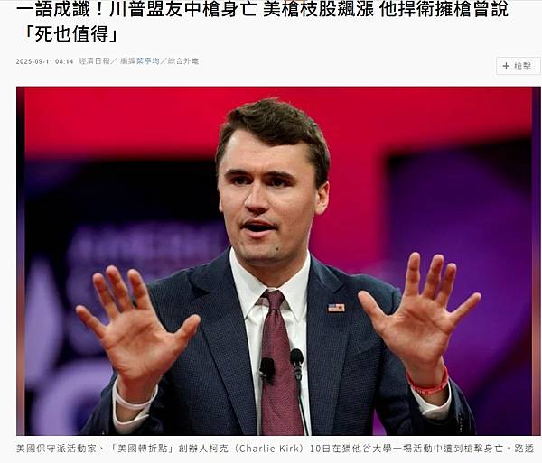 一語成讖!川普盟友中槍身亡 美槍枝股飆漲 他捍衛擁槍曾說「死也值得」 | 美國新聞 | 全球 | 聯合新聞網 https://bit.ly/4gp8cpy