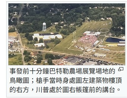 事發前十分鐘巴特勒農場展覽場地的鳥瞰圖;槍手當時身處圖左建築物樓頂的右方,川普處於圖右帳篷前的講台。