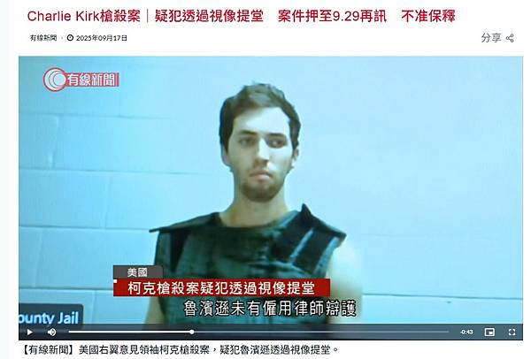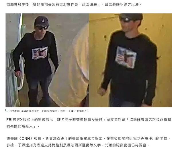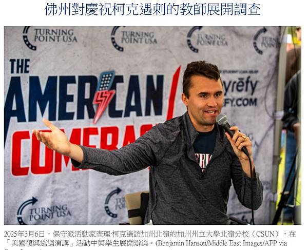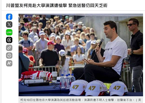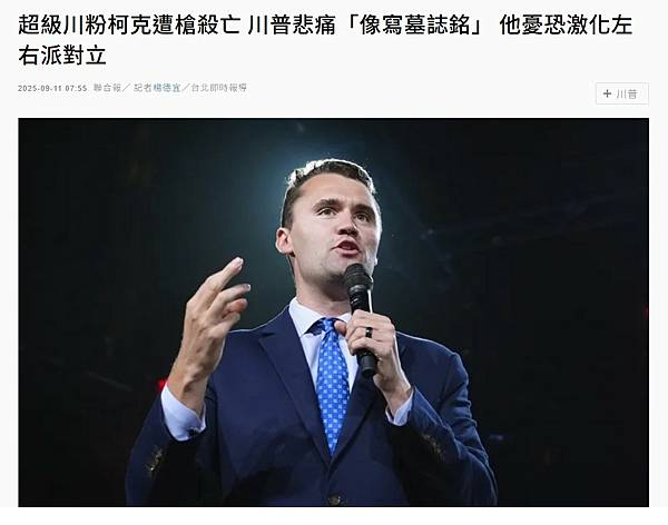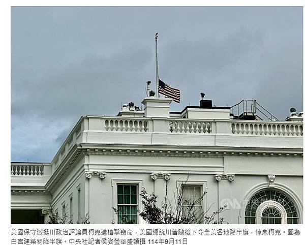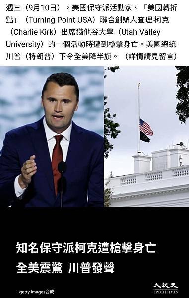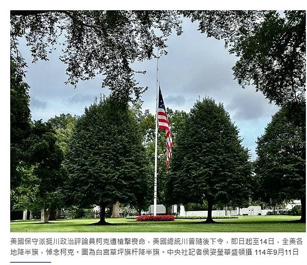美國總統川普的政壇盟友、美國保守派活動家柯克(Charlie Kirk)週三在猶他谷大學(Utah Valley University)的一個活動上發表演說時,遭到槍擊身亡;猶他州公共安全部表示,目前槍手仍然在逃。川普聞訊後也在社群媒體發文表示哀悼,同時宣布全美降半旗直至週日。