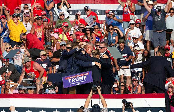 在現場發生槍響後的特勤人員和人群。FBI表示槍擊事件初判是針對川普的刺殺行動。槍手本人在行兇後即遭特勤局幹員當場擊斃;現場除了川普受傷以外,會場內支持者已知1人死亡,至少2人受傷。(攝影/Anna Moneymaker/Getty Images via AFP)