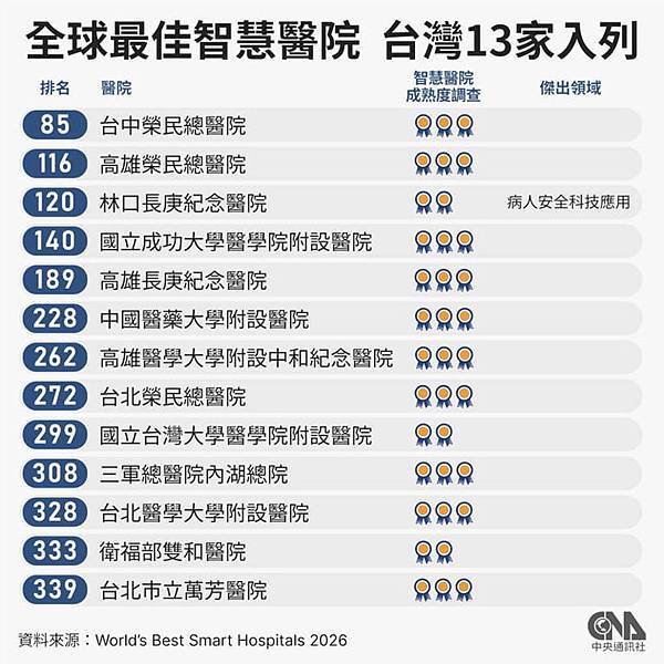 甫公布的全球最佳智慧醫院排行榜,此次榜單涵蓋30國、共350家醫院,台灣共有13家醫院上榜。此次評比主要依據「智慧醫院成熟度調查」、國際醫院評鑑聯合委員會(JCI)認證與獨立研究結果,特別強調人工智慧(AI)、自動化、病人安全與數位醫療創新等面向。