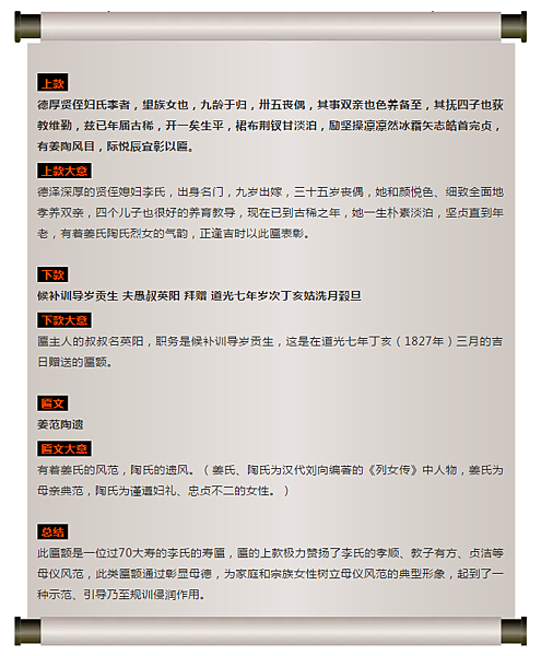 上款,讚譽李家一位厚德賢慧的女子,來到夫家後歷盡艱難,矢志努力。 35歲丈夫過世,李女侍候、順承公婆,和顏色;全力撫養四個兒子,教子有方。平日穿樸素,於淡泊,堅貞自勵,在北方的男人壽裡,李女冷若冰霜,令人敬畏。李女堅貞守節處方白頭,堪比漢代劉向《列女傳》中姜、陶二女,同為女中楷模。正逢李女六十大,理應制榜樣。