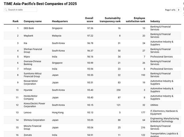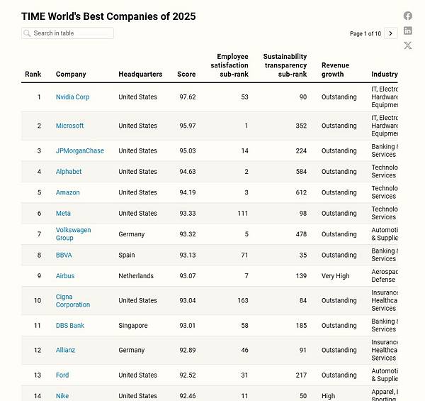 《時代》與美國調研機構Statista合作發布的「2025全球最佳企業」榜單,是由三大評比項目加權後的總分排名,分別是員工滿意度、營收成長和永續性透明度(ESG)。