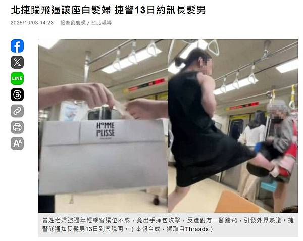 北捷踹飛逼讓座白髮婦 捷警13日約訊長髮男 - 社會 - 自由時報電子報