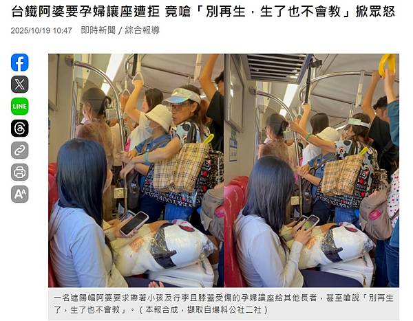 阿婆接著改口,稱希望讓座的是旁邊的小孩。聽到對方轉而要求孩子讓位,媽媽反問:「隔壁那麼多年輕人為什麼不去請?」阿婆回說「那邊坐滿了」,讓媽媽更氣:「這邊就有位置嗎?」結果阿婆竟酸道:「你要是有良心的話,想一下就知道了。」甚至惡言相向:「你不要再生了,生了也不會教小孩啦。」