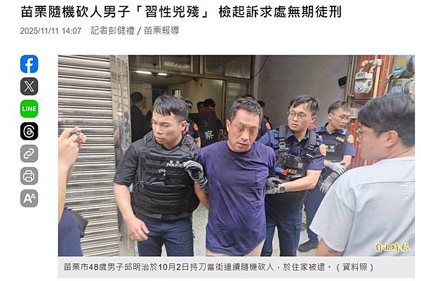 "苗栗隨機砍人男子「習性兇殘」 檢起訴求處無期徒刑 - 社會 - 自由時報電子報" https://news.ltn.com.tw/news/society/breakingnews/5242121