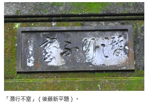 見返阪隧道北口、南口由後藤新平分別題字「穿月」與「噴雲」;苗栗隧道則由兒玉源太郎題字「功維敘」。明治36(1903)年竣工的二號隧道,北口由時任臺灣民政長官的後藤新平題字「開天」。七號隧道興建期間共發生9次崩塌事件,特別艱辛,明治40(1907)年完工由後藤新平於北口題上「巨靈讓工」、南口則由臺灣總督兒玉源太郎題字「一氣通」。明治41(1908)年完工的九號隧道是舊山線最長的隧道,也是最晚完工的一段,北口由後藤新平題字「潛行不窒」、南口則是第五任台灣總督佐久間左馬太題字「氣象雄深」。 "隧道題字|國家文化記憶庫 2.0" https://tcmb.culture.tw/zh-tw/detail?indexCode=Culture_Object&id=331643