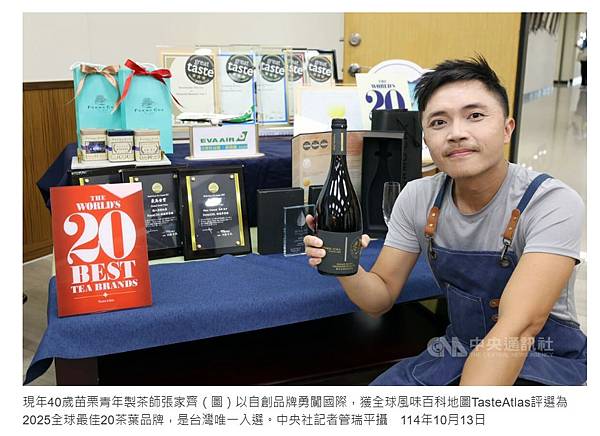 (中央社記者管瑞平苗栗縣13日電)苗栗青年製茶師張家齊以自創品牌勇闖國際,累積世界3大指標茶葉競賽最高獎項,今年更獲全球風味百科地圖TasteAtlas 評選2025全球最佳20茶葉品牌之一,是台灣唯一入選。