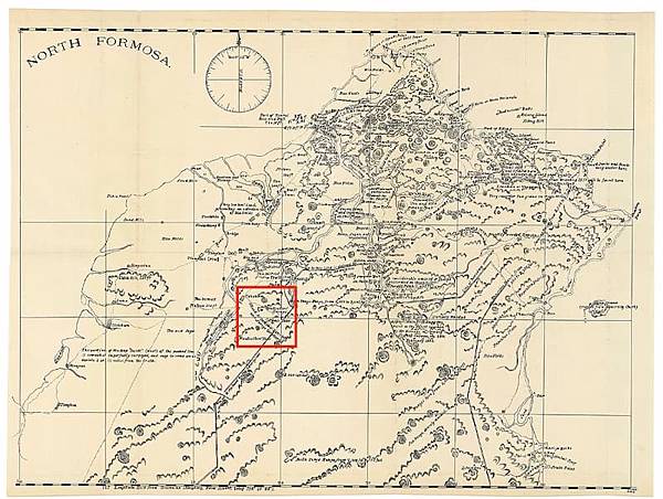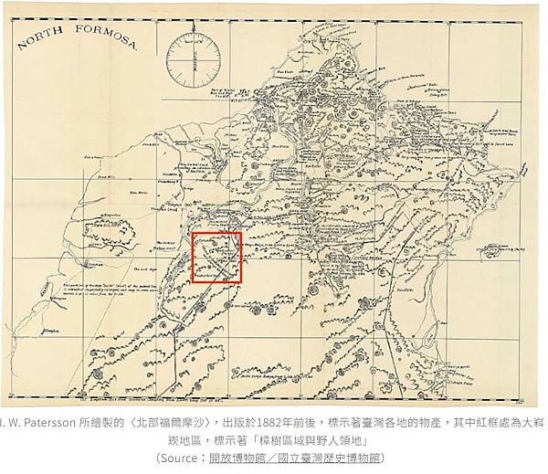 J. W. Patersson 所繪製的〈北部福爾摩沙〉,出版於1882年前後,標示著臺灣各地的物產,其中紅框處為大嵙崁地區,標示著「樟樹區域與野人領地」