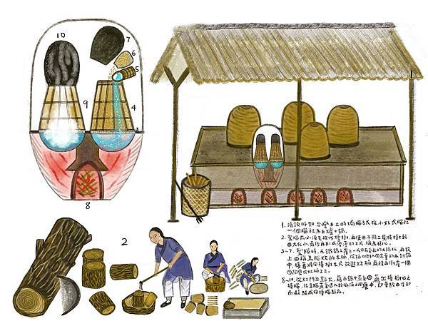 釜指的是古代的鍋子,碙是一種黃白色粉末或塊狀的氯化銨的天然礦物,這兩種器物顯示清初的小灶熬腦法是,利用碙將蒸氣中的樟腦結晶礙固下來。等到清代末葉,熬腦技術才有了改變,美人李讓禮的《台灣番事物產與商務》載:「製造樟腦…法極簡妙,不似日本之鈍也。日本皆將樟木入釜煮之;台地則析為細條,每條方圍二寸半,長三寸,叢插於磁罐之內,此器下通湯氣,湯氣上蒸,將逐條樟木之油蒸迫沸湧而出,與松枝之膠燃迫而出者極似。然後愈蒸愈沸,化為樟氣,上竄於冷水櫃,遇冷凝結,乃成樟腦。」"恆春的樟腦、殘存的腦灶-劉還月的避秦山|痞客邦" https://liu580220.pixnet.net/blog/post/327525804