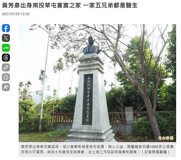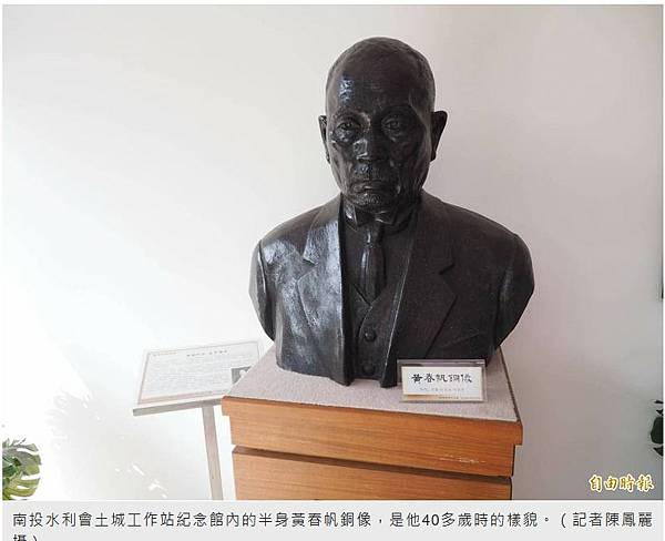黃芳彥出身草屯鎮望族,祖父黃春帆曾是草屯首富,熱心公益,開鑿龍泉圳讓1000多公頃農田有水可灌溉,南投水利會感念其貢獻,在土城工作站設有黃春帆銅像。(記者陳鳳麗攝)