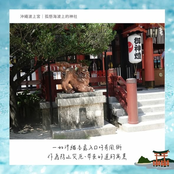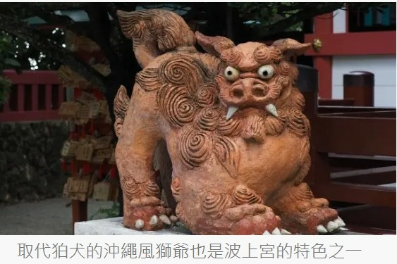 超越700年歷史,在二戰後毀壞只剩鳥居,歷經重建的波上宮融合琉球與日本特色,為拜殿屋頂及紅瓦建築,在日本神社多數平入式、妻入式屋頂樣式中獨樹一幟,而神社兩側狛犬是沖繩風獅(シーサー)鎮守,瞬間想到金門的風獅爺,其中的文化交融與淵源玩味。風獅爺作為神明的「差使」,守護的主祭神為伊邪那美命(いざなみのかみ),猶如日本神話中的創世神,創造許多島嶼和眾神,掌管任務多元,因而也成為全能神社。