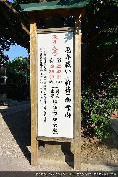 日本也有「犯太歲」!他們叫厄年,在台灣的習俗是那一年剛好輪到你的生肖的話,就是犯太歲,然後又有正沖對沖的問題,所以平均六年會犯一次太歲-不過在日本,人一生只會有三次的厄年,就是牌子上分別列出男女的三個數字。放著的木箱子可以投入香油錢,金額多寡就像台灣一樣金額不限,但日本的5元發音和「緣」音相近