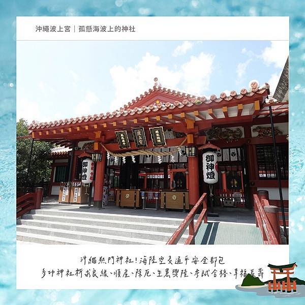 波上宮以日式小學書包御守在旅遊觀光聞名,神社周邊不僅海陸空景全都映入眼簾,海陸空也交通全都包,匯聚眾神的神社還能祈求姻緣、順產、除厄、生意興隆、考試合格、幸福長壽等,難怪是沖繩參拜的熱門神社!