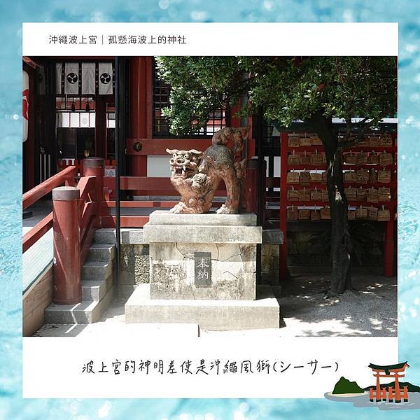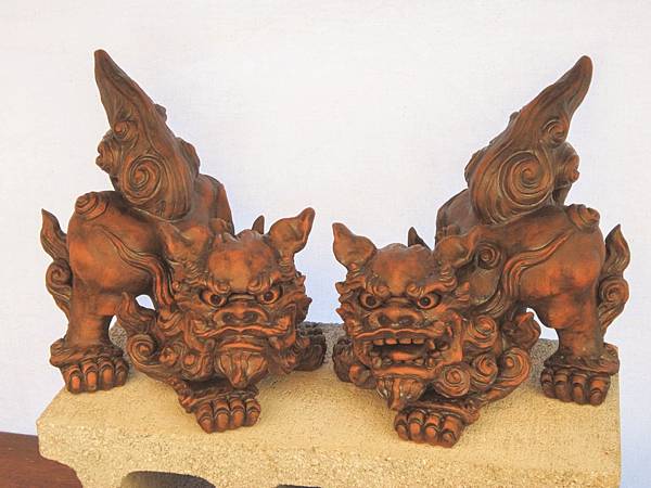沖繩的「風獅爺」稱為「Shisa」(シーサー),是當地的守護神,通常成對出現,用於鎮宅驅邪並招福。牠們被擺放在家戶門口、屋頂或村落的高處,嘴巴張開的是雄獅,負責吐出邪氣,嘴巴閉起來的是雌獅,負責守住福氣。這些雕像約在14世紀時從中國傳入,是沖繩文化的重要象徵。 波上宮 - 維基百科,自由的百科全書