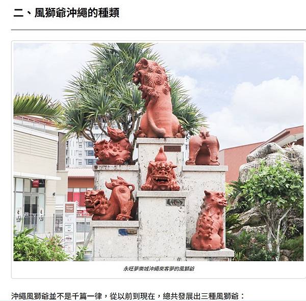 沖繩風獅爺-先是中亞語的「SHE」,傳入中國後叫「獅子」,最後來到沖繩變成了「シーサー」古代中東的斯芬克斯(獅身人面像),在傳入中國後成了「獅子像」,並在13~15世紀間傳到沖繩。風獅爺沖繩的種類①宮獅子②村落獅子③家獅子---沖繩風獅爺姿勢:「爬行型」&「坐姿型」沖繩風獅爺公母閉著嘴的母獅(左)|張著嘴的公獅(右)一隻張嘴、一隻閉嘴,代表著「吐出邪氣、守住福氣」
