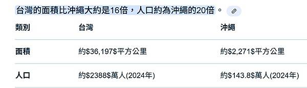 台灣的面積比沖繩大約是16倍,人口約為沖繩的20倍