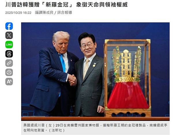 在美國總統川普亞洲行的最後一站,南韓29日向這位以偏愛閃亮禮物著稱的美國總統,贈送了一頂巨大的新羅王朝「金冠」複製品。根據《華盛頓郵報》報導,此舉被視為亞洲各國領袖,試圖透過迎合川普個人喜好,來緩和貿易與國防緊張關係的最新外交象徵操作。