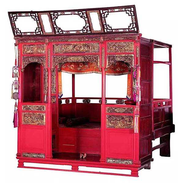 錯彩鏤金、以千日之工打造的“千工床”。喜床也是紅妝中必不可少最為講究的傢俱。婚床往往朱金木雕,泥金彩漆,其豪華和精緻的程度可以與明清帝王的禦床相媲美。豪門大戶相互攀比不惜為此耗銀萬兩。工匠們往往歷時數年甚至數十年才能製作出一張床。紅妝喜床也因此稱為“千工床”,千工床的前部有一個小平臺稱為踏步。踏步上面設有飄簷花罩和卷封頂,右邊常放一隻小廚上置鐘、帽筒、花瓶、鏡箱、茶具、燈檯;左邊則放一隻馬桶箱。後半部才是臥床本體,除了再一道雕花門罩、垂帶、遮枕外,床內有的還設有書架擱板、角櫥、錢箱、點心盒、防身器具等。