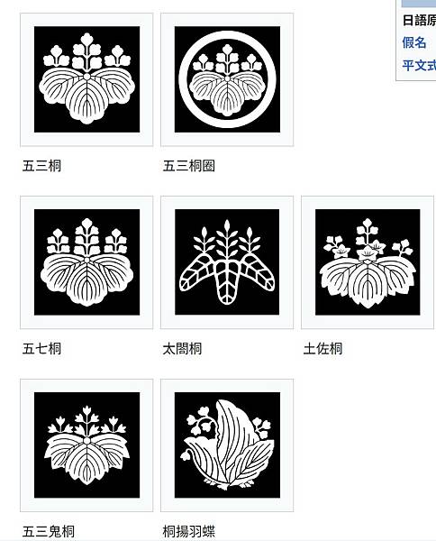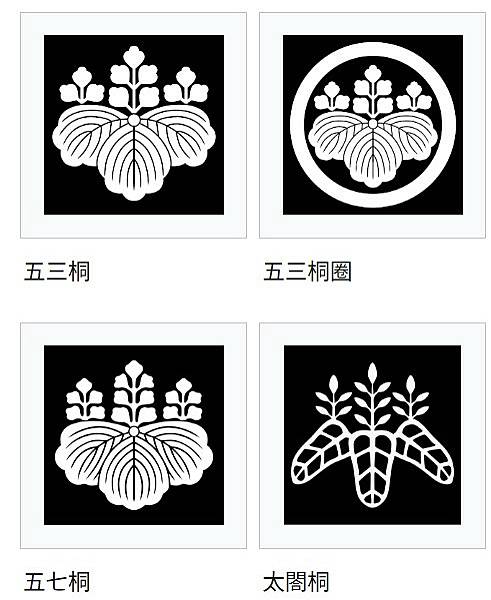 (圖片說明:下為內閣總理大臣所用的五七桐紋章,也是現在的日本國紋章。下左為秀吉專用的太閤桐家紋。下右為秀吉賞賜給家臣的五三桐紋章。)