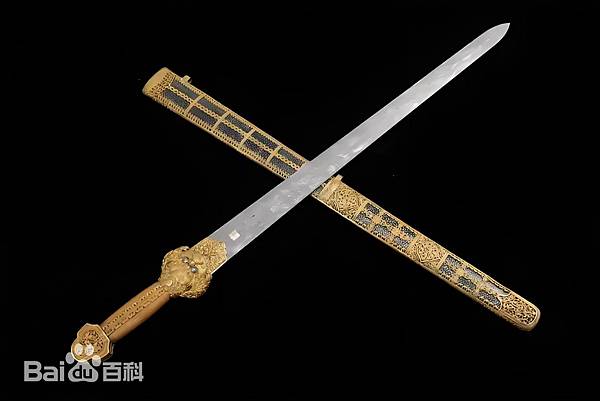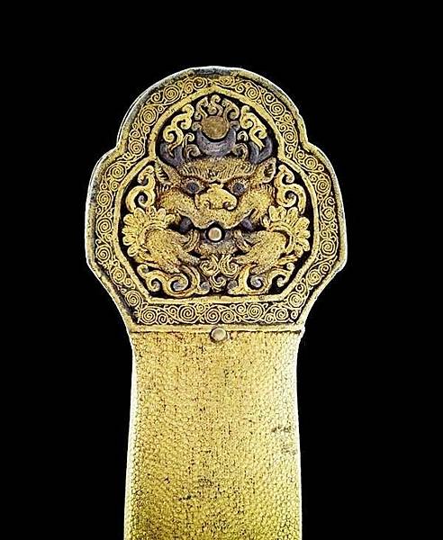 這把劍造於1420年,是永樂大帝送給西藏一位活佛的禮物,劍格的動物是佛教瑞獸「瓊」。劍身中間有劍脊增加了劍的強度,簡單而經典。劍鞘為交錯紋案,以及浮雕花麵。 「永樂劍」全長103.5厘米,劍飾極盡奢華,通身包裹金銀,大量使用鏤空雕刻與鏨刻等製作工藝,堪稱中國古代刀劍製作的代表作之一