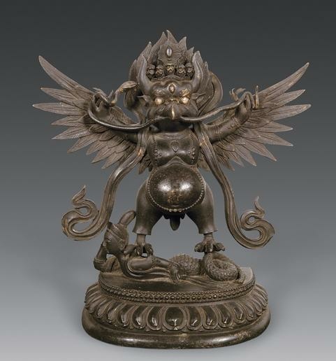 為佛教瑞獸,也稱為獅子。印度藝術中出現的獅子在藏族藝術文化表現中可以視為神話中的雪獅。這頭長著綠松石鬃毛的白色雪獅是掌管西藏雪山山脈的厲妖。就像佛教從印度「跳過」喜馬拉雅山一樣,人們只有在白色雪獅頑皮地從一個山巔跳到另一個山巔時才能有幸一窺其雄姿。雪獅是西藏的動物徽相,裝飾在就地方政丵府的官印、硬幣、鈔票和郵票上。在唐卡上,雙師常被詼諧地畫在積雪的高山之巔,與鹿和雙鶴一樣,它也構成了和諧主題。但有時也把獅子畫成小貓滾繡球的樣子。中國內地的一個傳說認為,母獅的奶從其爪尖產出,獅子在戲玩帶有空洞的球時會將一些奶水沾在球上。在西藏藝術中,該球呈現三色「喜旋」狀。