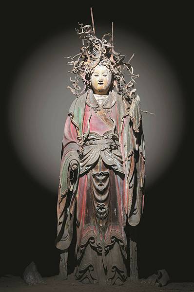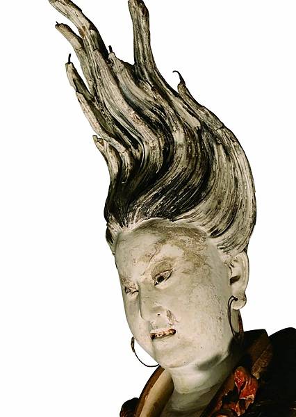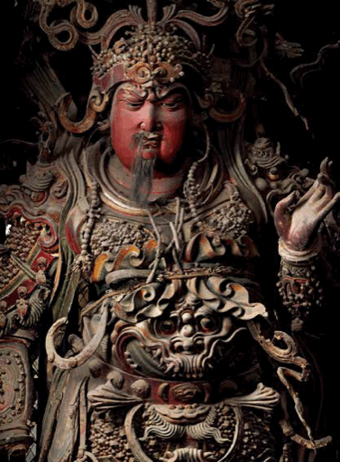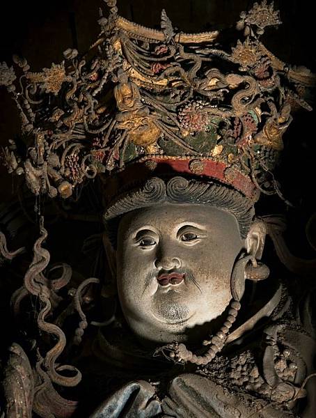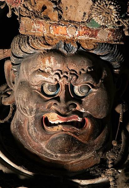 王樹村在《塑神秘譜》中提到,戰國時期的雕刻家桓赫就已經總結出鼻目等五官的具體塑造方法。我理解的五官集中在人物塑造的藝術表現上似乎另有深意。鐵佛寺二十四諸天造像的一大特點是冠冕和衣褶的表現,有一種不厭其煩的繁瑣和華麗,線條在百轉千迴中著力盤曲,這種細密畫一般的表現在面龐之下形成一個灰度的平面,直接反襯出集中的五官之像下龐的白瓏與淨,使造玲的光玲和影音本身。如果臉部塑造只是中規中矩,難免就被埋沒在繁復的鐵線之中了,這種雕塑語言用在滿堂文氣的女神男神們身上,不僅令其光芒凸現,也表達了一種風流詼諧的態度。而對於張力十足的武將們,那就塑造出極盡誇張的臉部肌肉,令其眼目睛光四射,散發出攝人心魄的雷霆之怒。