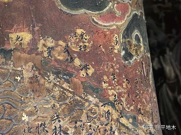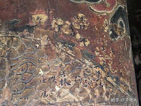 在大殿的右側柱子上,較高處依稀能見到用墨筆書寫的文字,拍照後經辨認,為類似鄉規民約和崗位責任的文書。有〝執事人到壇後均需肅靜,不得大聲宣嘩違者誐罰〞等字樣,白話文,應屬民國時期所書,近百年,也屬文物。