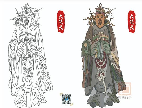 在工匠的巧手之下,鐵絲、鐵線呈現出立體、鮮明的線條美感,“注重線條”也是繪畫傳統留給雕塑藝術的遺產,是中國雕塑區別於西方雕塑的重要特征。此外,鐵佛寺內這批彩塑,也非常善於利用色彩來表現人物的性格與身份,以施金的裝飾,來表現文官及女性的富貴祥和,以白色的肌膚,來展現韋陀的青年形象,或以紅、綠、藍等純色,來營造武將、天王在視覺上的沖擊感。