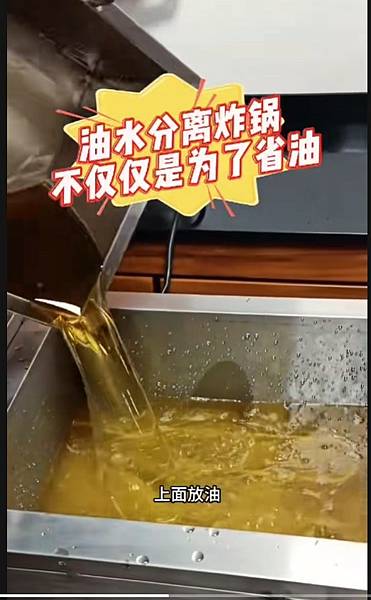油炸機的「水油分離」設計利用油比水輕的原理,將水置於下層,油置於上層;油炸時產生的食物殘渣會沉入水中,避免殘留在油中焦化變質,延長炸油壽命,並能減少油煙。這種設計有助於維持油品品質、降低油耗、提升炸物口感和品質,並讓設備更容易清潔。 原理與好處 利用油水密度差異:油的密度小於水,會浮在水面上;水在機器的下層,油在上方。過濾殘渣:食物炸製過程中掉落的殘渣會因重力沉入下層水,不會積在油鍋底部或附著在炸物上,降低炸油品質變差的風險。節省用油:殘渣不燒焦會延長換油週期,相較於傳統油炸機可節省約 \(50\%\) 的用油量。提升炸物品質:透過水蒸氣補充油品的水分,有助於炸物保持細膩、柔軟的口感,同時也能避免動物油的產生。環保與衛生:油品不易變質,產生的油煙也較少,更為環保衛生。易於清潔:由於殘渣會沉入水中,不像傳統炸鍋容易卡住焦化,因此較容易清潔。 缺點 操作失誤:若操作不當,例如先排出水而未關閉加熱或油品未完全降溫就排水,可能導致油品損失或損壞。可能影響油品品質:若未定期清潔,水中的殘渣在浸泡過久後可能導致整鍋油變質