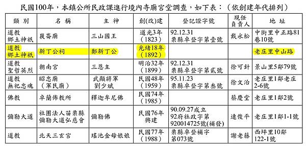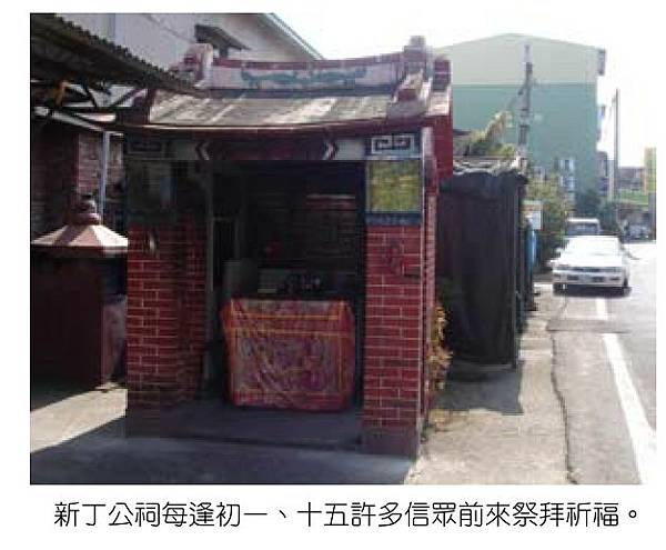 新丁公祠是本鎮一座來歷很神奇、又饒富趣味、也是大家耳熟能詳的特殊小廟。座落於老庄里中山路旁,外形像一般小土地公廟,但廟名卻是「新丁公」,以祀奉鄭新丁公為主神。據本鎮蔡維忠轉述, 相傳,光緒18年(1892)時,本鎮老庄人詹顯騫到豐原「焗腦」,看到當地新丁公廟香火鼎盛,來往香客絡繹不絕,乃於是年「割火」回罩蘭搭建茅屋奉祀,初以「令旗」表徵祭拜,延續香火,威靈顯赫。後庄民獲新丁公托夢見其樣貌,並指示雕塑新丁公金身奉祀,才刻出今日文質彬彬新丁公神像,每逢農曆初1、15,前往膜拜的人很多。