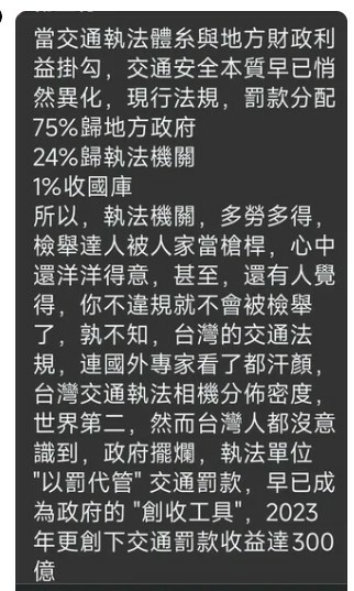 這種分配比例導致地方政府和執法單位都將罰鍰視為重要的財源來源,而非改善交通安全的工具。