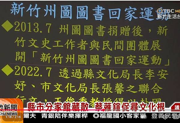 蔡蕥鍹說,新竹縣重要的文史資產長期離鄉背井,導致文史工作者要借閱資料,還得由縣市政府行文給國史館徵求同意後才能借閱,甚至連牯嶺街都能找到州圖流落的圖書,怒批「文化治理政策本末倒置,一錯再錯,堪稱一場荒謬又可悲的文資悲劇!」